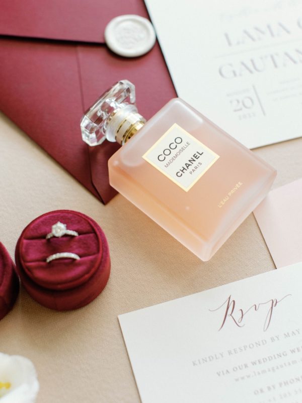 [field title=”Special Detail #2″]Lama and Gautam wanted their guests to leave with a favor to remember them by. They received a burgundy box embellished with a gold foiled monogram of the couple which included an evil eye symbol from Lebanon, tea from India and sugared almonds from Greece. [/field]