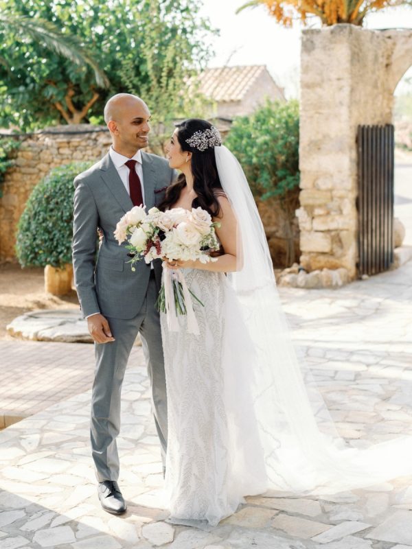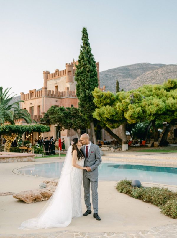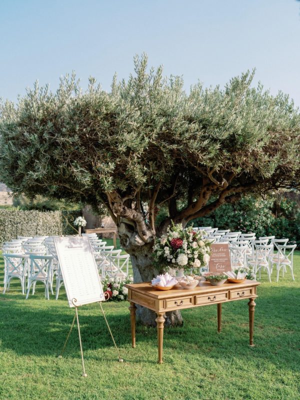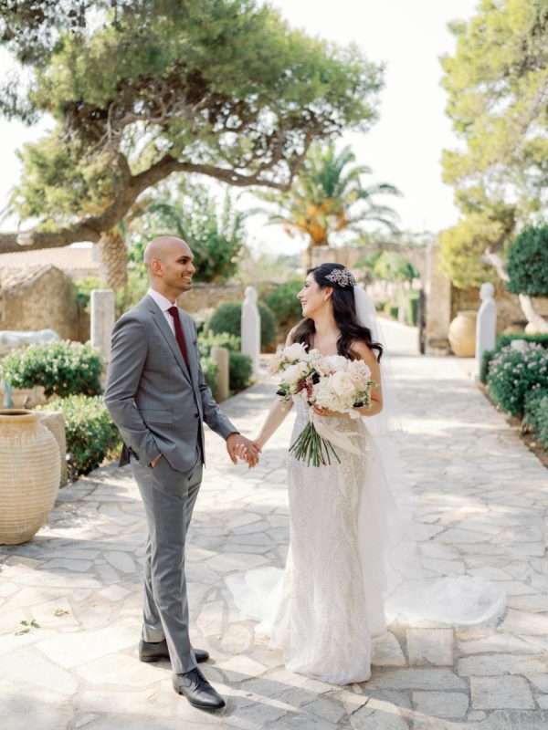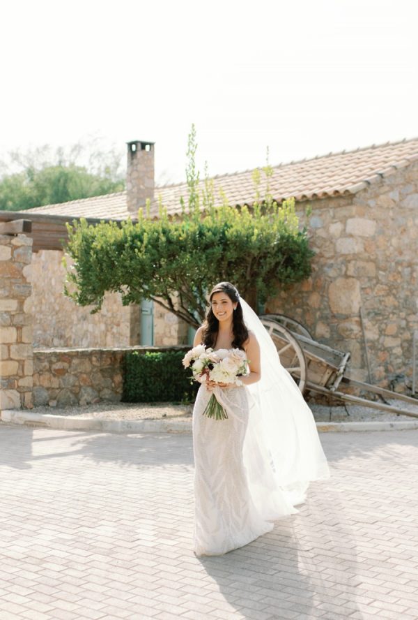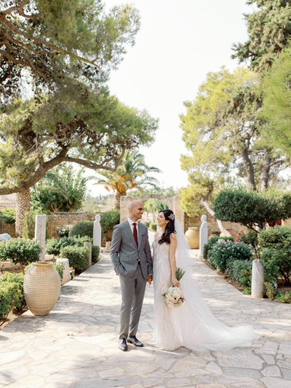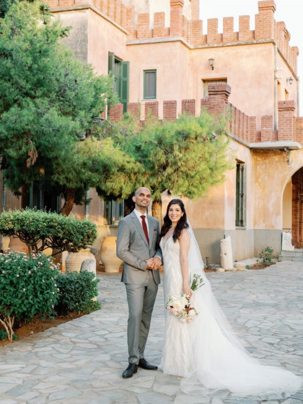 Lama and Gautam aimed for a classic and elegant affair in which the venue itself would serve as the stage for their nuptials. Pyrgos Melissourgou, an ancient castle in the south of Athens was selected for its history and old charm, lush olive grove and picturesque chapel. The 15 acres private estate with gorgeous sea views provided the ideal backdrop for both the ceremony and reception.