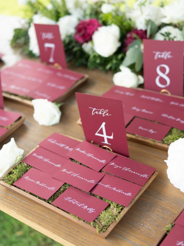 [field title=”Wedding Colors”]Lama and Gautam opted for a moody yet classic palette for their nuptials. A beautiful combination of burgundy, blush, white and green was featured throughout their wedding decoration from florals to stationery and favors. The richness of burgundy contrasted beautifully with soft pastel colors and stole the show with its striking effect! On the other hand, blush which adorned the bridesmaid dresses and emanated from the centerpiece garden roses added a romantic and timeless touch. Delicate gold accents enhanced the color scheme.[/field]