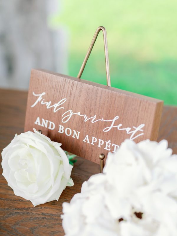 Oak wooden signs were used to display table numbers and instructions for all stations such as the refreshments and toss bar, the photobooth, the place cards and the guestbook table.