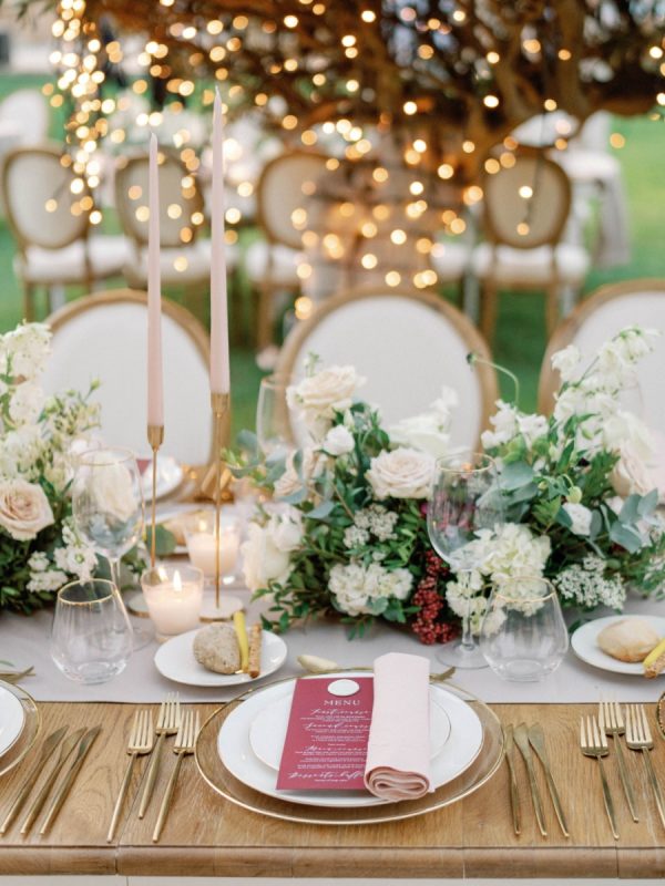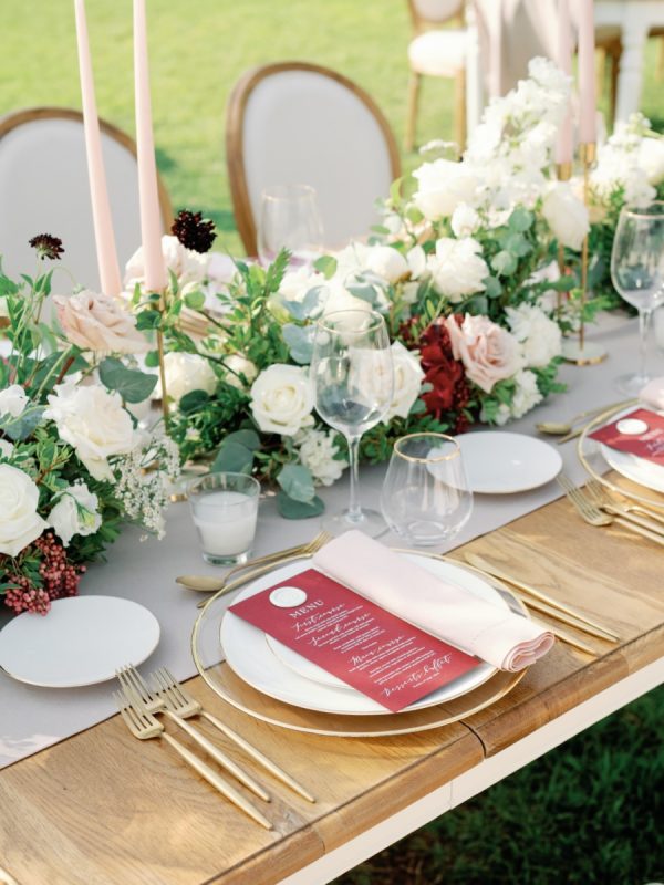 Provence tables were decorated with an oat-colored runner and paired with Louis chairs. Long gold candleholders with blush candles matched the elegant set-up while burgundy menus created a beautiful contrast with the gold rimmed tableware.
