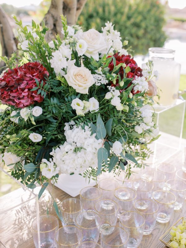 The flowers were a gorgeous mix of classic choices such as white peonies and blush garden roses contrasted with bolder maroon sciabiosas and dark red hydrangeas. The evergreen foliage consisted of eucalyptus and myrtle leaves.