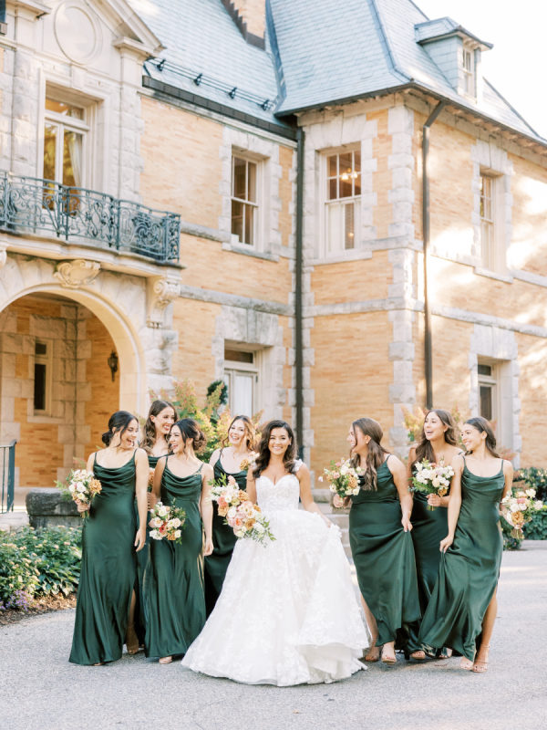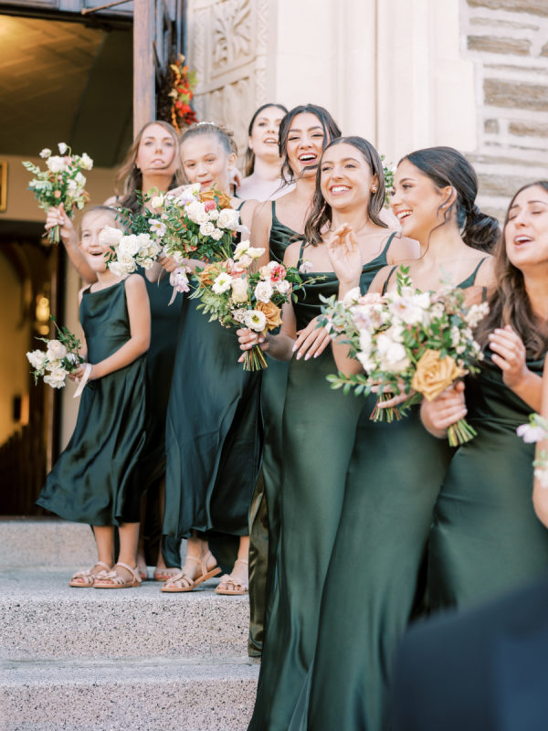 [field title=”Bridesmaid Dresses”]My bridesmaids wore matching full-length dresses from Revelry in a gorgeous deep olive satin fabric – a neutral color with more warmth and depth to complement the overall color palette, florals, and greenery decorating the venue. The goal was a style that was elegant, modern, and could realistically be worn again. I have always loved the classic, simple silhouette of a satin slip dress and appreciated the extra support and structure Revelry’s dresses had compared to other satin options. The overall quality and opportunity for home try-ons helped ensure that my bridesmaids felt comfortable and were just as excited to wear the dresses! The flower girls matched in the kid’s midi-length version of the bridesmaids’ satin style, also from Revelry, and looked adorable![/field]