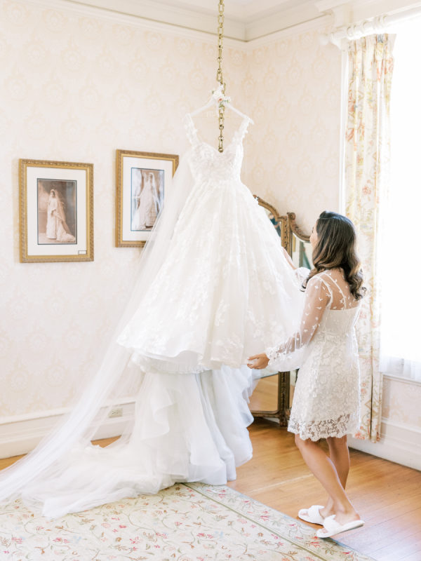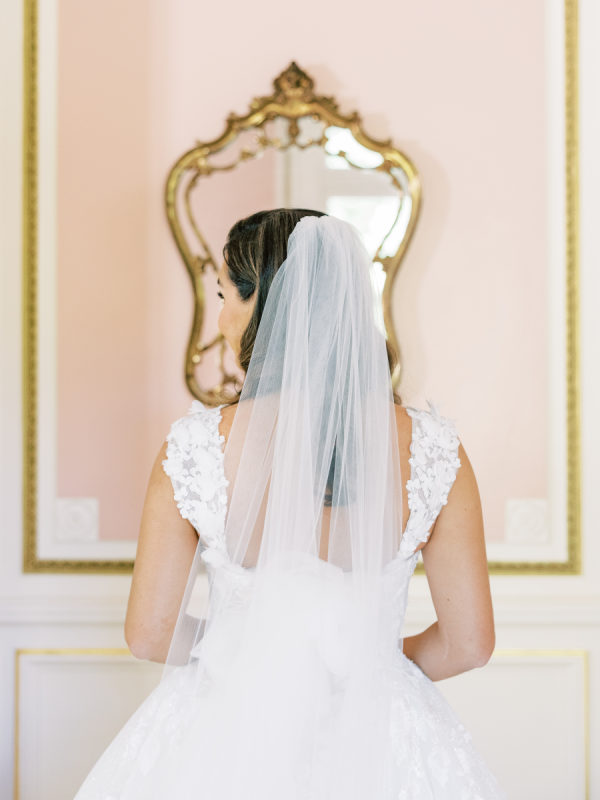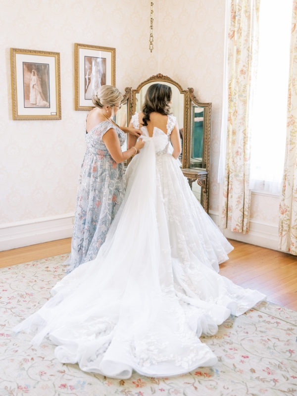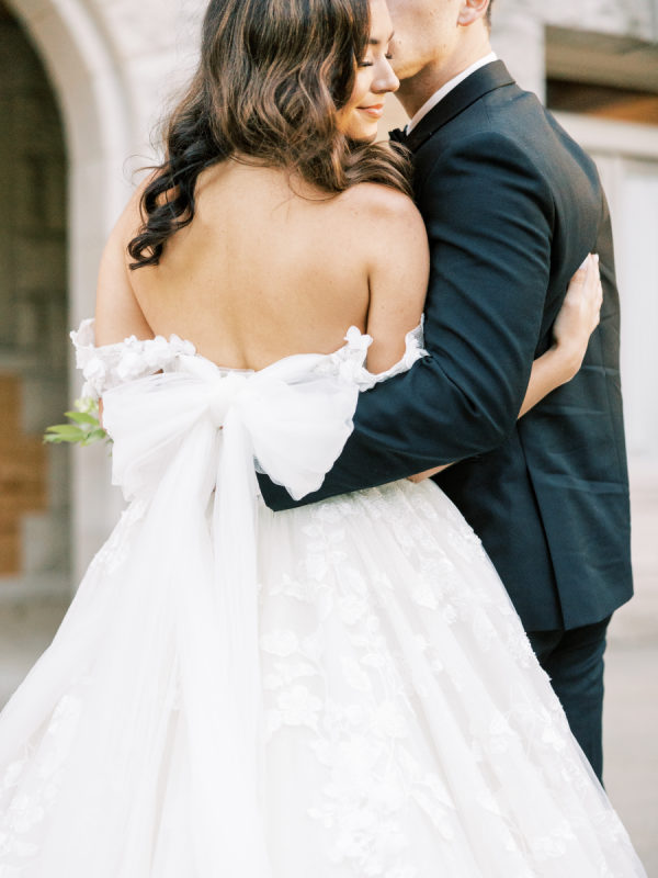 [field title=”Wedding Gown”]Perfect for the romantic dreamer with a love for modern luxury” is how designer Martina Liana describes this voluminous ball gown. Between the whimsical 3D floral elements, exposed corset, sparkle tulle layers, and cathedral length train – this dress had everything I could ever want. I added my own personal touch by customizing a removable tulle bow out of streamers that attached to the back of the dress and flowed into the train, and adjusting the straps throughout the day for three different looks.