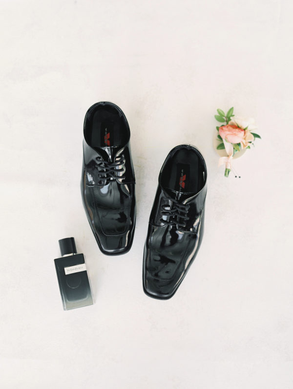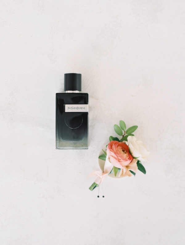 [field title=”Groomsman Attire”]Dan chose a classic black tuxedo with a peaked lapel and satin bow tie for his wedding day attire. Inspired by his dad’s wedding fashion, he opted for a black satin cummerbund, but selected a tapered pant for a more modern fit. He finished his look with YSL’s Y Eau de Parfum and engraved cufflinks gifted by his bride. The groomsmen wore matching black tuxedos with black satin vests to differentiate their look from the groom’s.