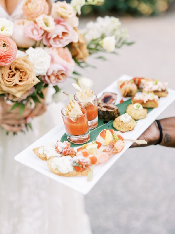Cocktail hour included some delicious hors d’oeuvres, such as mini lobster rolls, crab cakes, chicken sate, and tomato soup shooters with grilled cheese bites by Sage Catering. Philly cheesesteak egg rolls were a necessary addition as our families both originate from the area. Our only regret was not having the chance to eat more of the delicious filet dinner ourselves, as we ended up spending the hour making rounds to our guest tables.[/field]