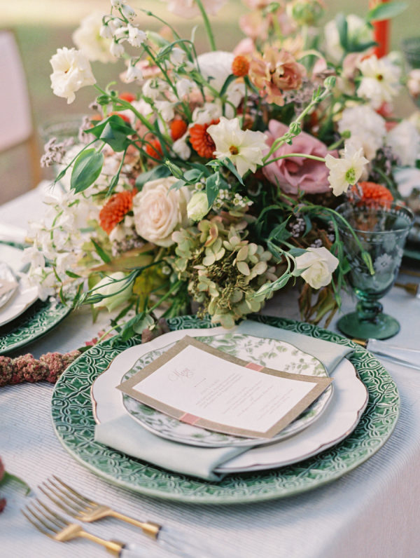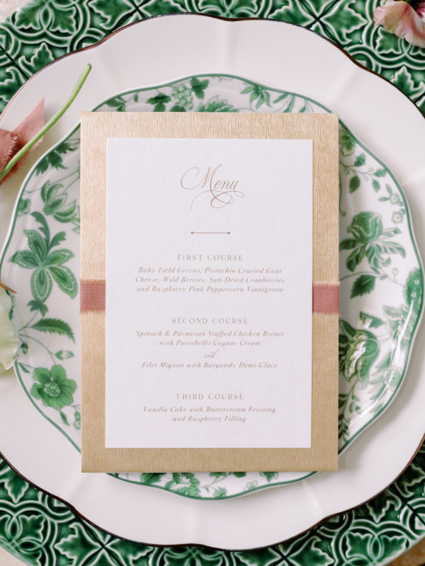 Custom stationery, provided by Hazelwood Paper Co, displayed a blind embossed pattern around the edges of the invitation, matching the green color of the charger plates in the tablescape. The vertical invitation sleeve and back pocket, also blind embossed, included a wax seal embellished with dried florals. The envelope liner was made with textured metallic gold paper. Thanks to the ingenious creativity of Kristin Hazelwood, a dual-purpose card at each seat served as both a name place card and a menu that was printed on the other side. This simple, personalized component of the reception experience is not only a conversation piece, but would serve as a memorable keepsake for every guest!