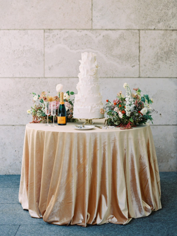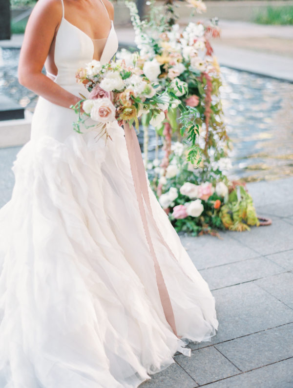 A recurring theme throughout this shoot was a pleated pattern, as seen in the menus, table linen, candle holders, reception dress, and bridal accessories. The wedding gown, escort display, and cake also include ruffled textures. Jennifer knew that Posh Couture Rentals would be perfect for providing table pieces. “Starting with the linen, I knew we needed texture! I also wanted to bring in green pieces to compliment the Nasher’s outdoor space, so the chargers, napkins, cake plates and etched glassware gave us that garden-esque feeling,” said Jennifer. These thoughtful choices gave the shoot a whimsical touch, surprisingly complemented by the contemporary sculptures in the garden. Olivia Merrit with Olive Grove Design provided floral arrangements perfect for the space. After collaborating with Jennifer, Olivia believed that an “overgrown feeling” would best fit the reception tables. “I wanted organic and lush florals for the reception table, so I chose stems and blooms that would emulate a garden.” said Olivia. The ceremony backdrop features one of the most iconic sculptures in Dallas. Olivia felt it was vital to incorporate the structural aspects of the venue. “…harlow stands were chosen for the base of the ceremony floral installation. It was important to not take anything away from the sculpture as the focal point for the ceremony, so I kept the florals low and not overbearing.” Olivia said.