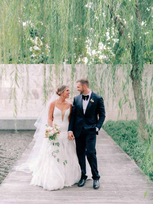 As for fashion, the bride wore The Wondrous gown. Designed by Ines Di Santo, the dress features a structured bodice with a delicate mesh open back. Your eye is drawn down to the full, textured skirt, making the dress feel effortlessly feminine. The floor-length horsehair veil completed the look beautifully. Later, the bride changed into a BHLDN pleated mini-dress with a ruffled neckline – a fun fashion statement for cutting the cake and strutting the streets in style!