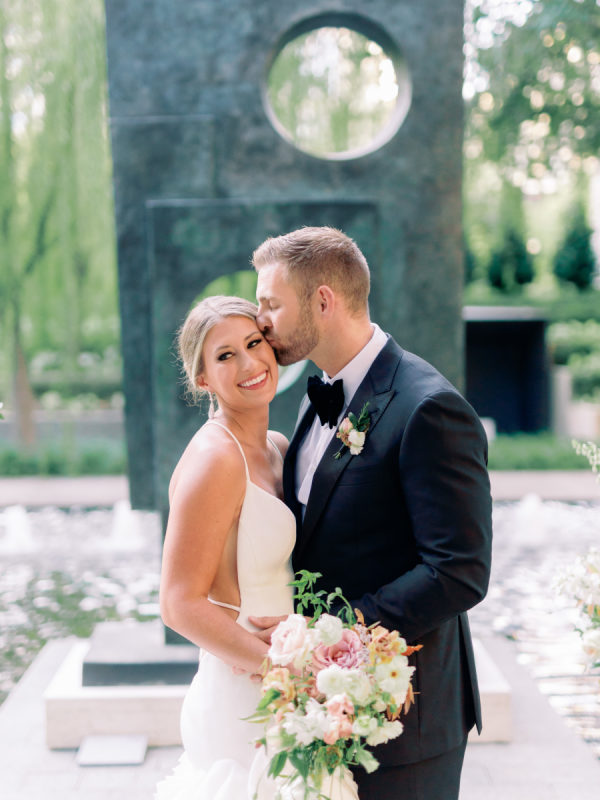 Feast your eyes on this modern wedding inspiration with a romantic twist at the The Nasher Sculpture Center in Downtown Dallas, Texas. Jennifer Heasley, owner of Turn the Paige Events, planned a colorful and unique art-inspired shoot captured by Kelsey Logsdon with Kelsey LaNae Photography. The stunning venue and vibrant, linear elements throughout this editorial helped these two achieve a contemporary vibe with plenty of allure. Located in the heart of the Arts District, The Nasher Sculpture Center is home to some of the most iconic sculptures in Texas. Who knew such a lush garden could be hiding amid towering skyscrapers?