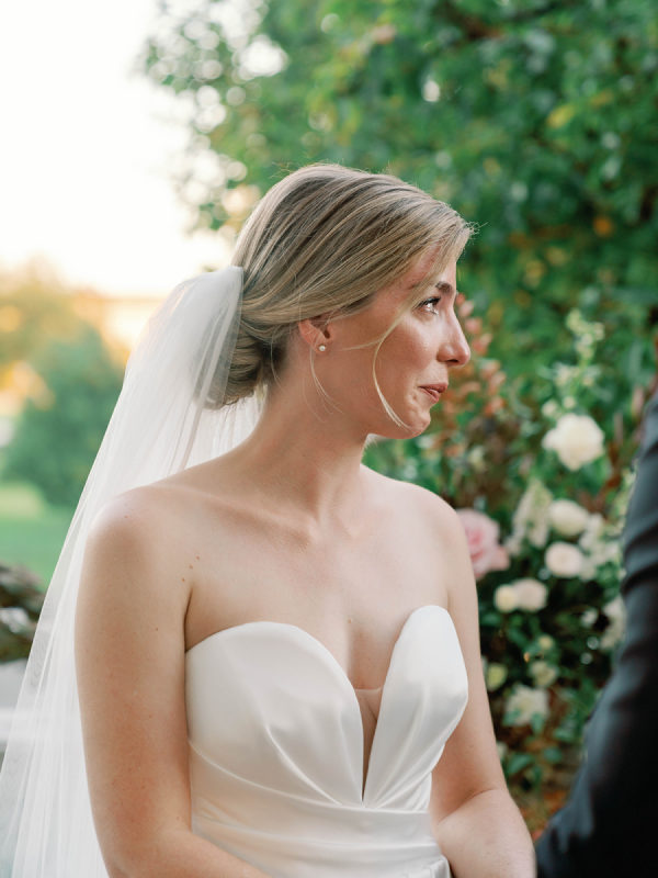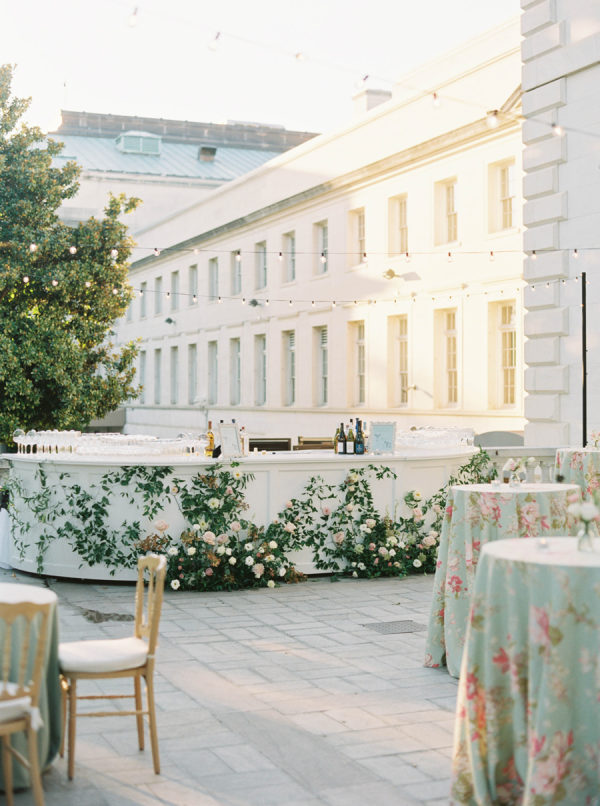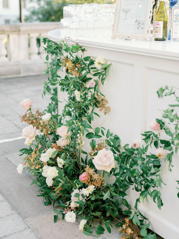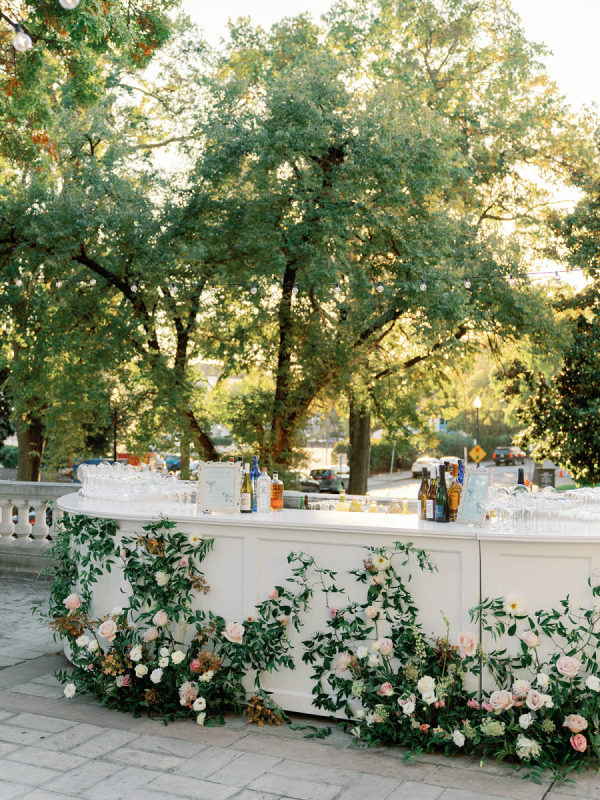 Following the ceremony, guests enjoyed an open-air cocktail hour on the Portico. A statement bar covered in florals continued the French Garden theme with bistro string lights overhead as the sun set into the evening.