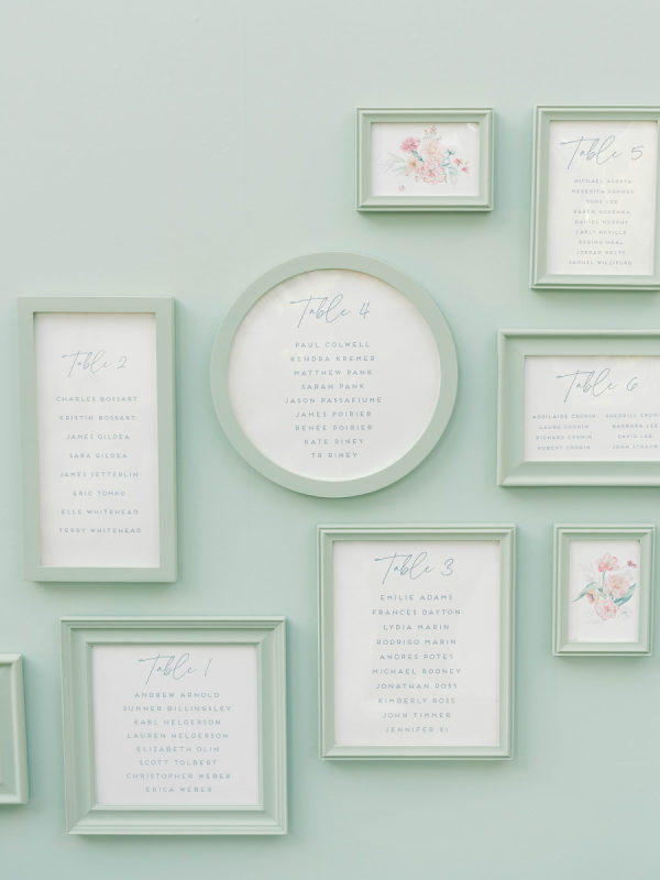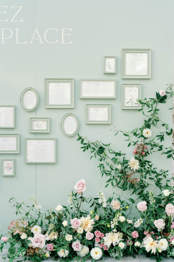 A custom backdrop wall featured monochromatic gallery art inspired frames in sage green to lead guests to their seats for dinner. The top of the frame included the French phrase “Trouvez Votre Place” translating to “Find Your Place” – with so many of Lili’s family having traveled in from France, it felt like a thoughtful way to make them feel at home.[/field]