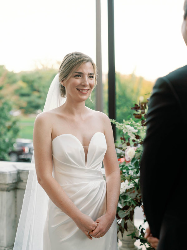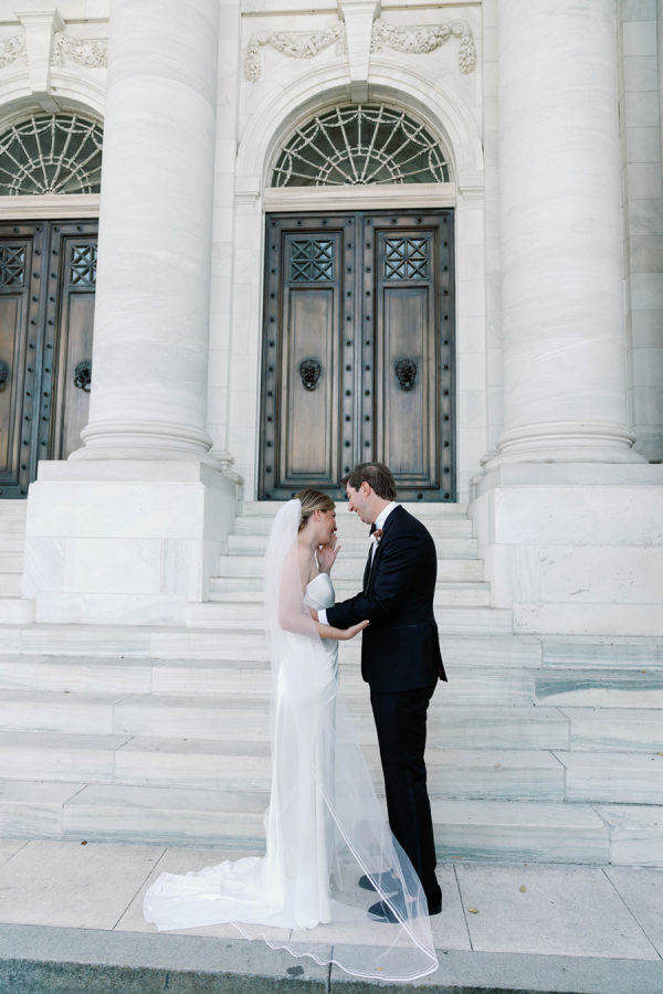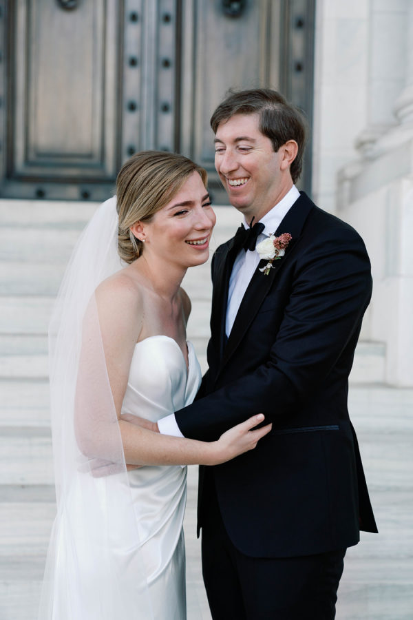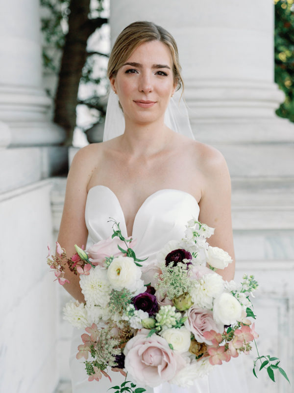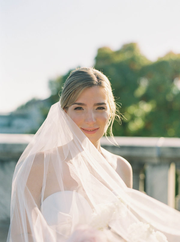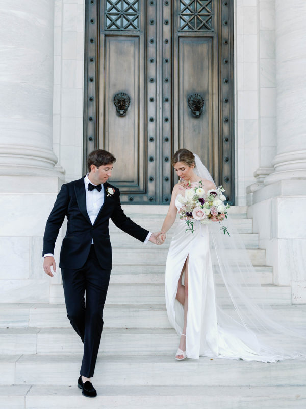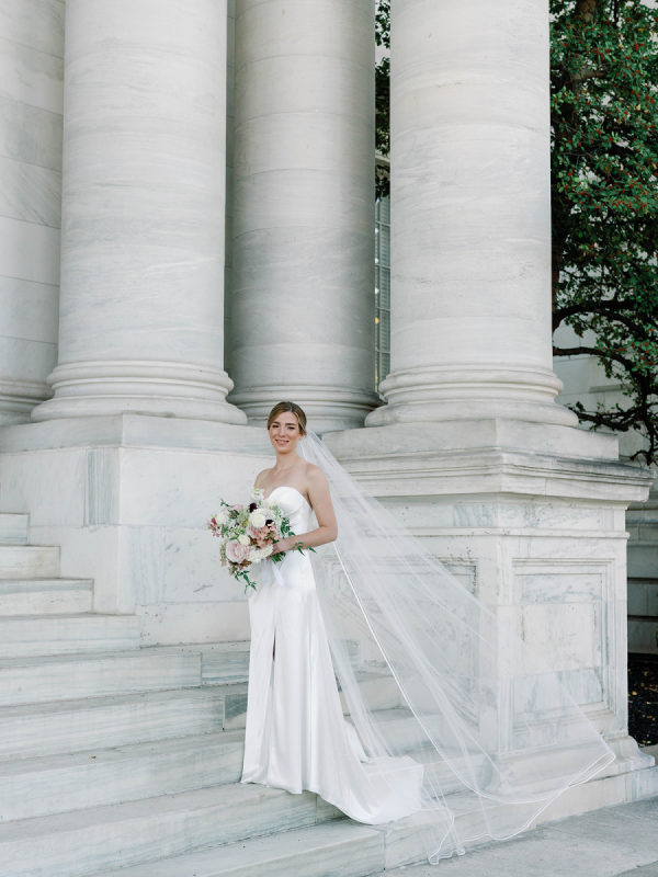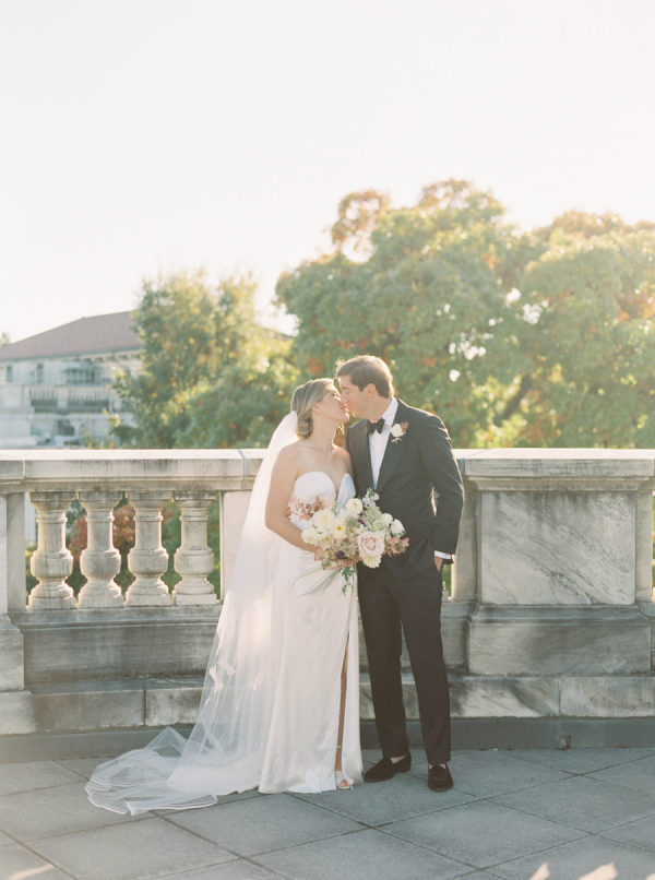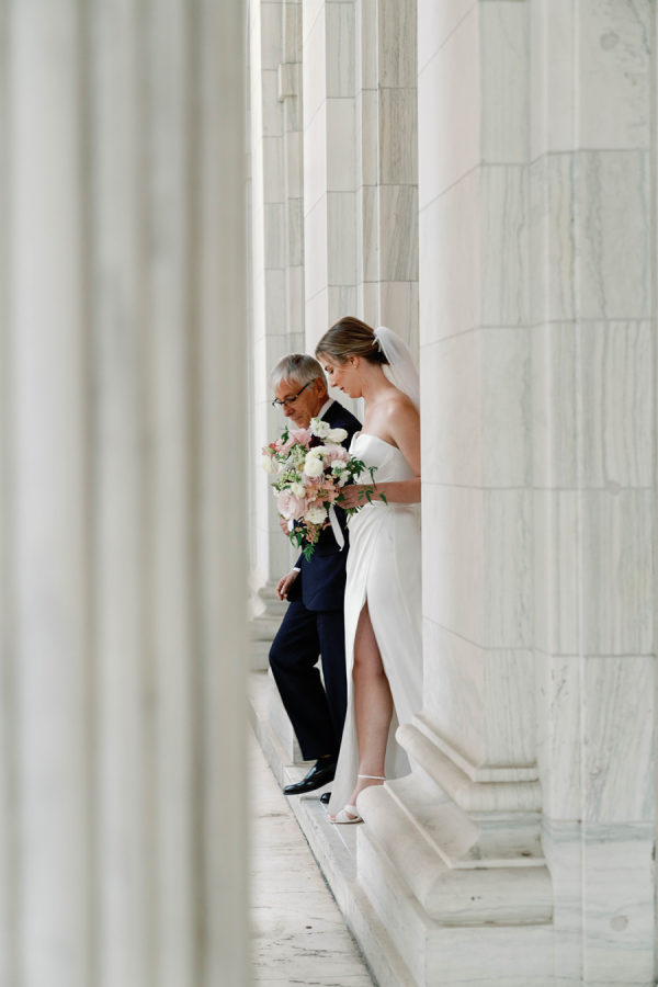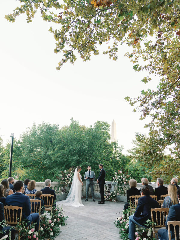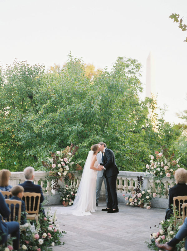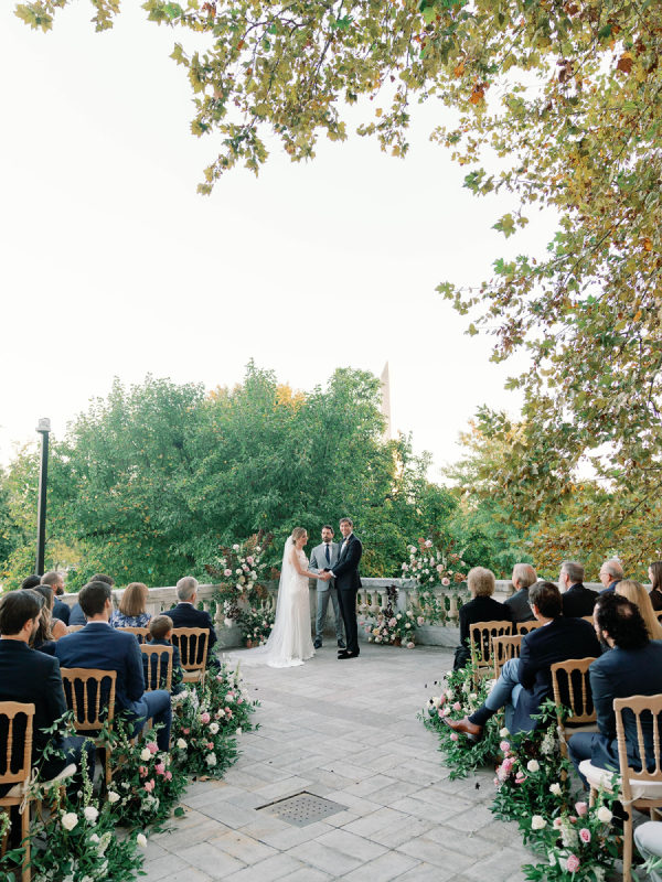 [field title=”Readings, Ceremony Music, Reception Songs”]They exchanged vows on DAR’s Portico overlooking the Washington Monument. French garden inspired floral arrangements lined the aisle and the stone banisters behind the altar to soften the space while feeling organic and elegant. A string quartet performed “La Vie En Rose” as Lili came down the aisle with her dad. [/field]