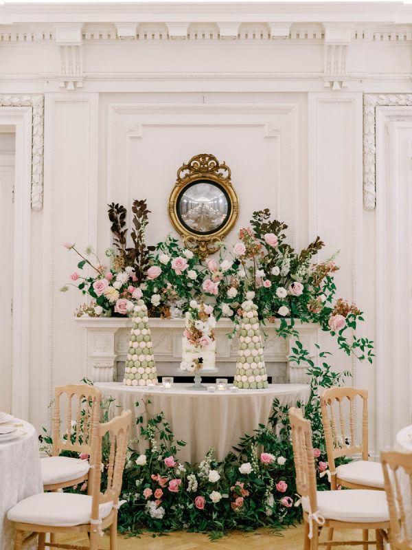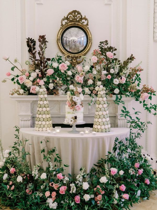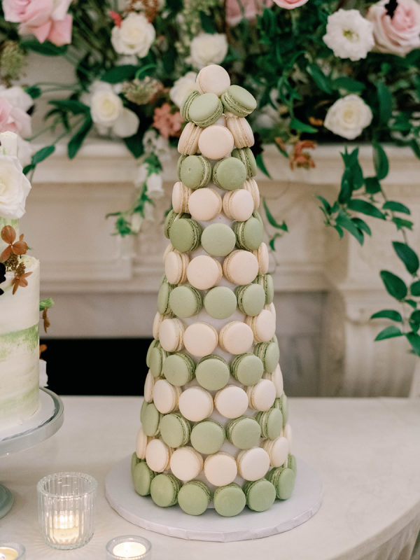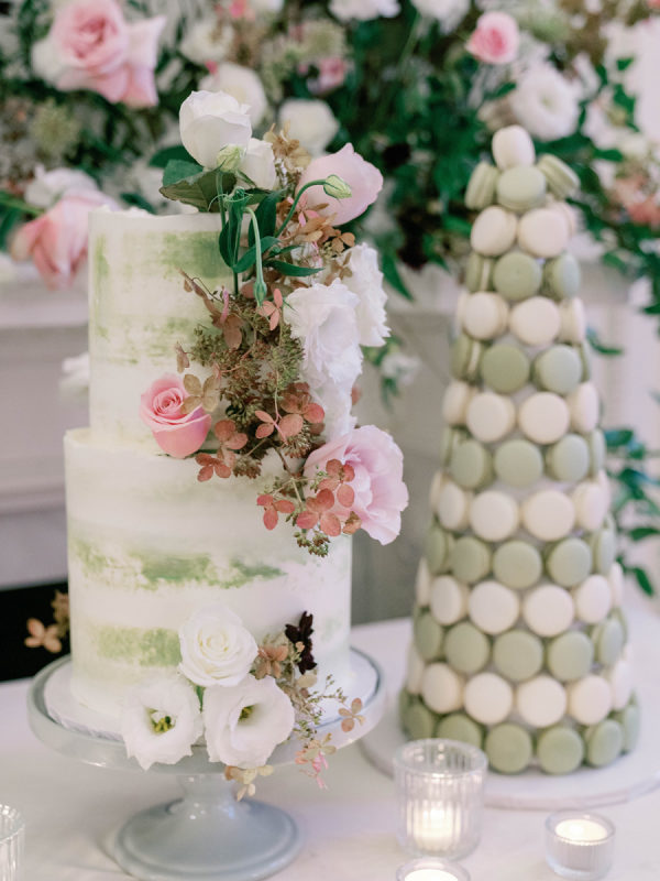 [field title=”Wedding Cake”]Ending on a sweet note, a Chambord buttercream cake featured a deckled texture and hints of subtle sage green with fresh flowers, along with quintessential French macaron towers in passion fruit and lemon. Florals from the ceremony were repurposed for a wow factor to complete the dessert table look.[/field]
