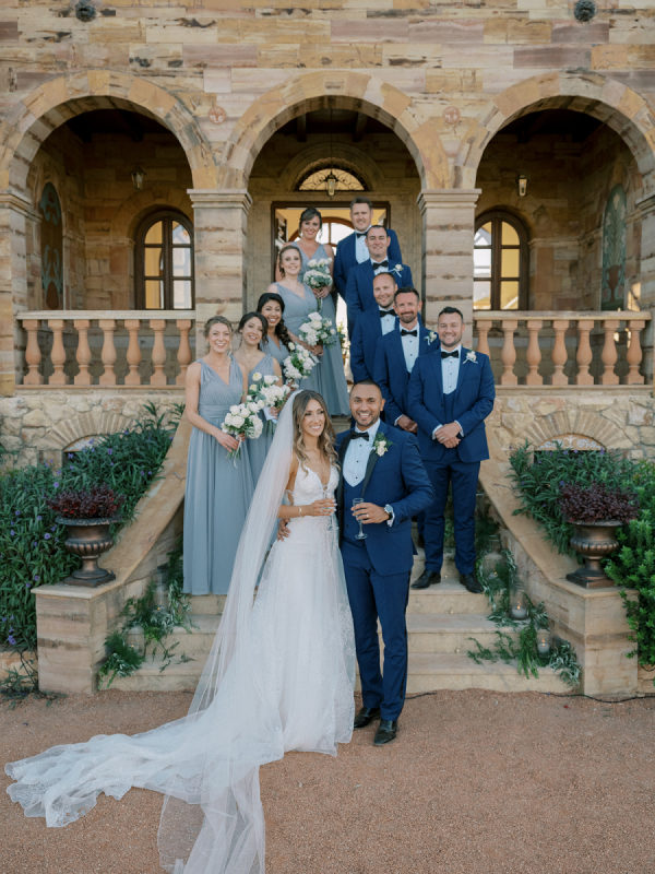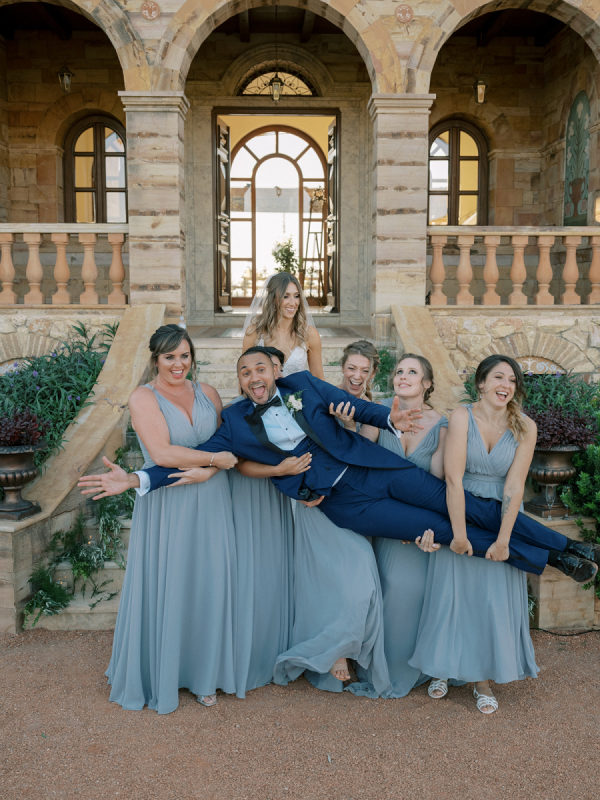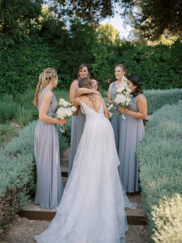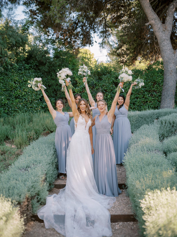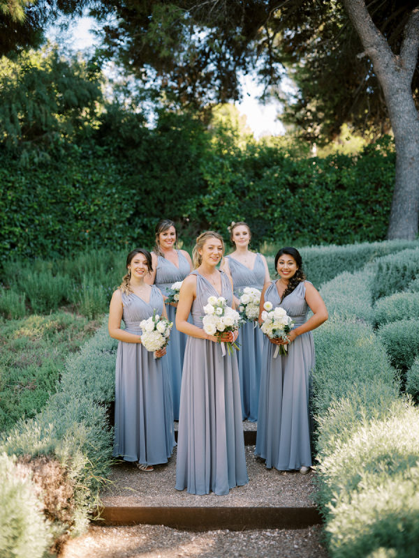 The five bridesmaids looked stunning in their elegant blue-grey dresses, which complemented the overall theme of the wedding perfectly. Their sleek, form-fitting silhouettes added a touch of glamour and refinement.
