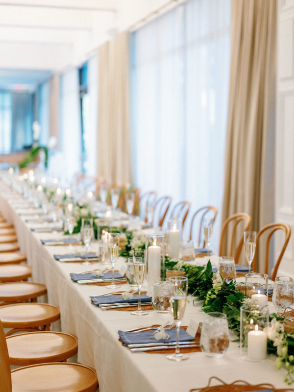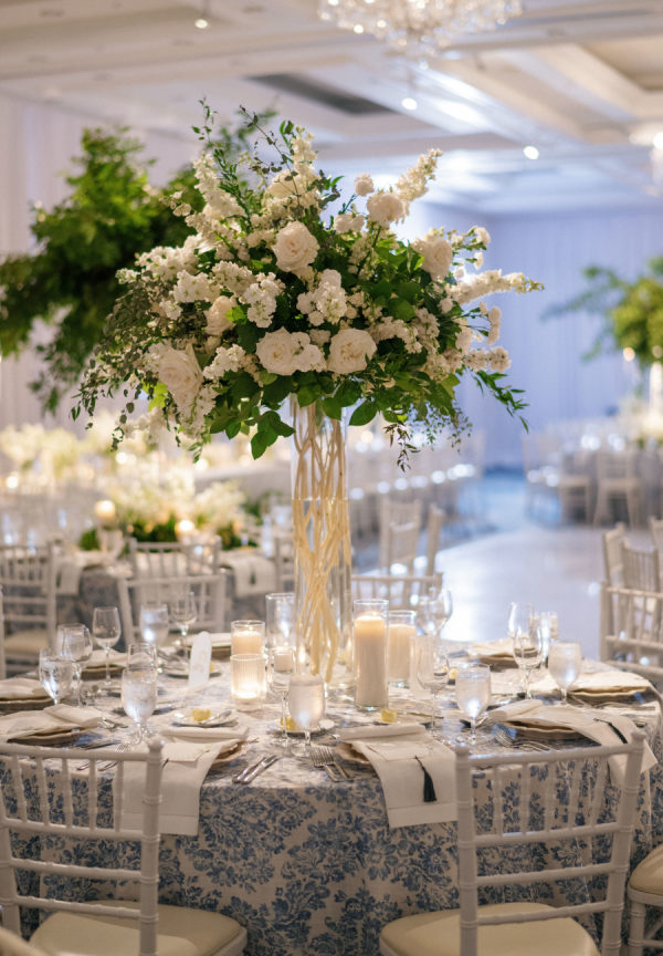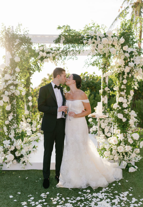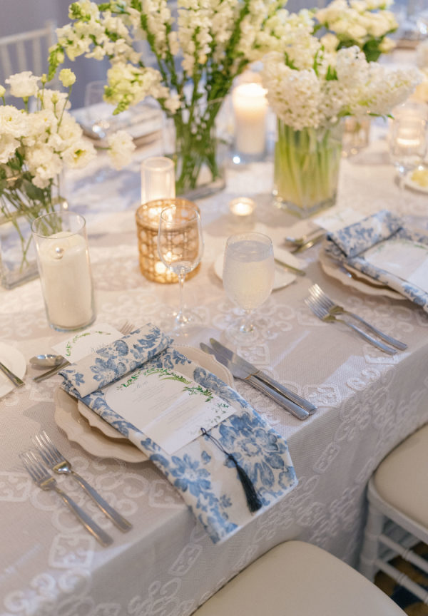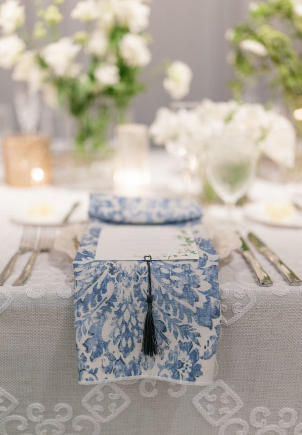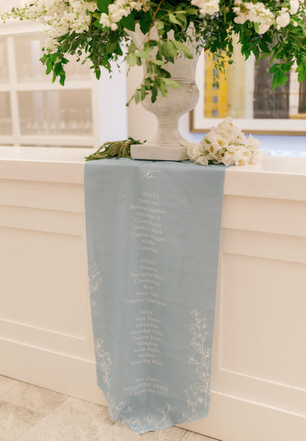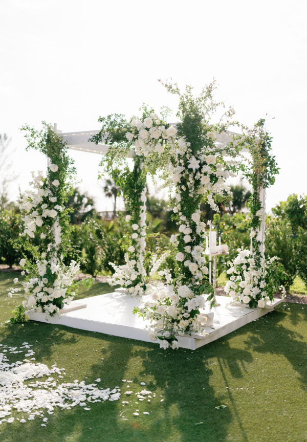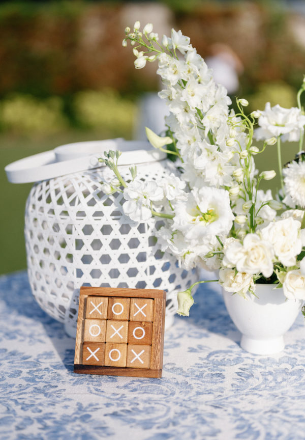 [field title=”Florals & Decor”]To celebrate Florida we leaned into the beautiful blue tones the ocean provides and paired that with lattice work that compliments the old Florida lifestyle we love here. Soft white Garden Roses and Sweet-pea provided that true bright white that helps modernize the esthetic. We played with pattern to keep the energy light and playful while staying true to the lattice pattern that began as the accent to the otherwise traditional Chuppah structure custom designed for Madalyn and Sam by Trinity Rentals. The lattice design could also be found in their escort display that was built onto a hedge wall and constructed on site by Kaleidoscope Florals with tags that showed X’s and O’s. The X’ and O’s were a key element too as the couple shows their love by saying “I love you like XO”. We took that sentiment and thread it through to the Menus designed by Script Me Pretty and the Lattice paper with a subtle x and o hidden within. Small wooden Tic Tac Toe games could be found on cocktail tables for a little lighthearted fun to continue the xo playful gesture.
