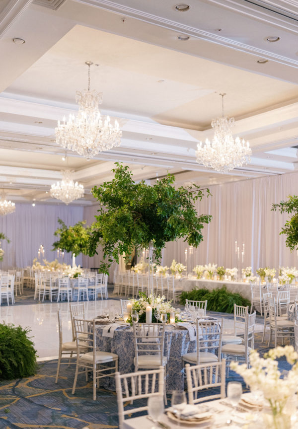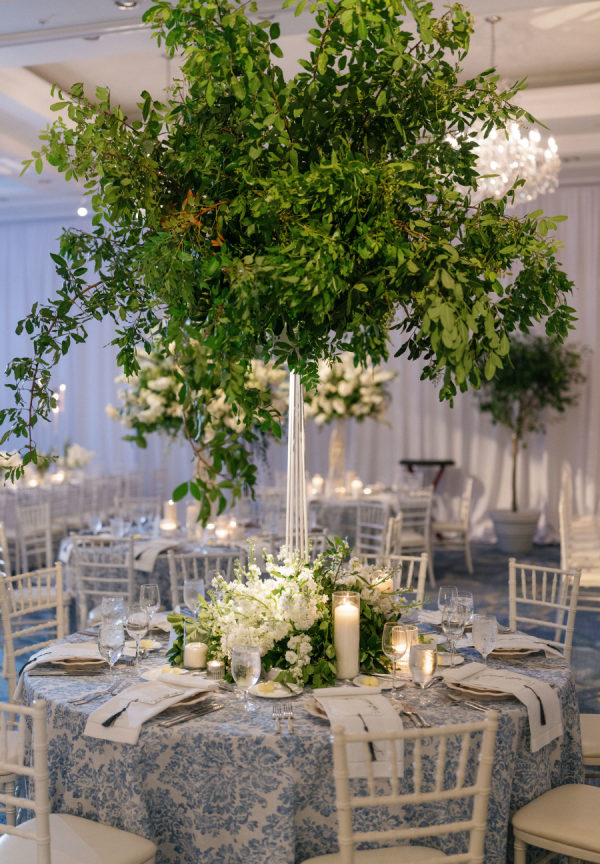 We wanted to fill the space with candlelight and florals so we opted for tall modern lined candelabras and large scale floral trees created by Kaleidoscope florals. The lighting was the icing on the cake by Luminary and CO to highlight the tall florals and give dimension to the entire space. -JetSetWed[/field]