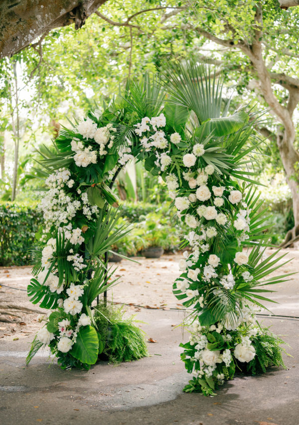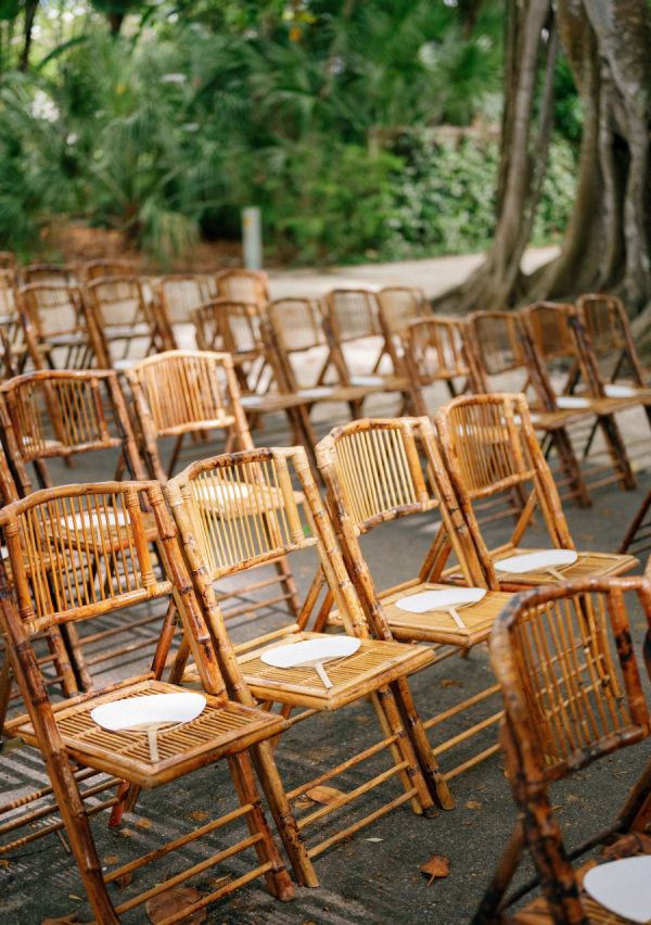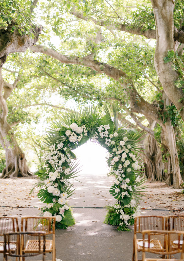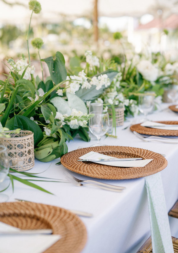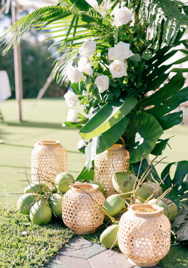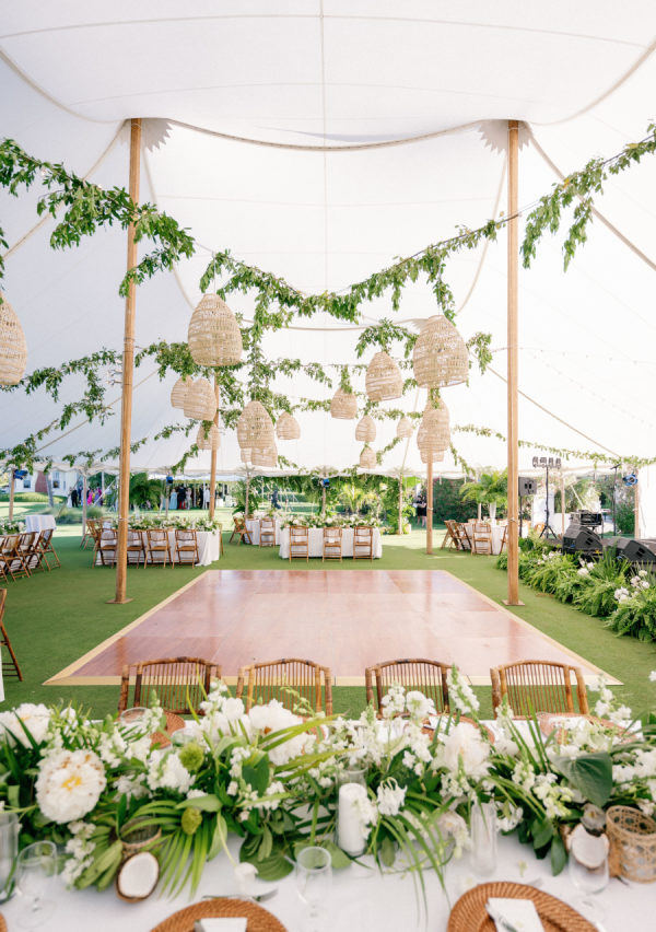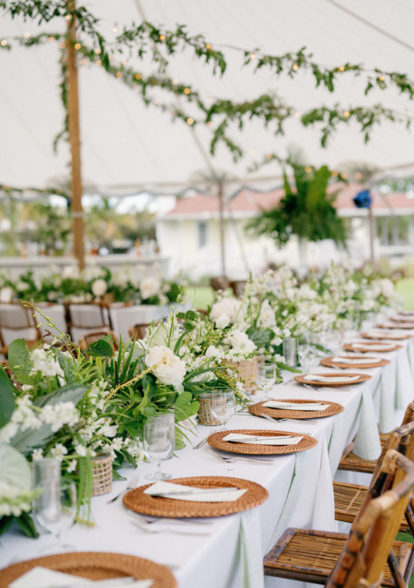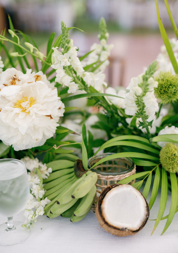 Kaleidoscope Floral had amazing decorations made up of ferns, white florals, and tropical greenery at the ceremony. There were raffia baskets overhead at reception with tropical greenery and white flowers, along with white votives in raffia and crystal candleholders. The white tablecloths added a touch of elegance. The raffia chairs from A Chair Affair brought the natural outdoor elements indoors.