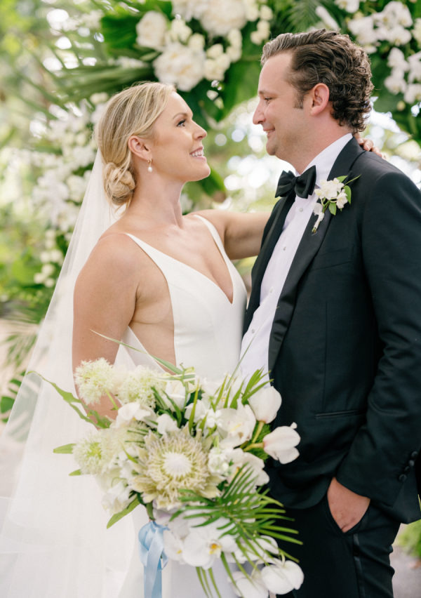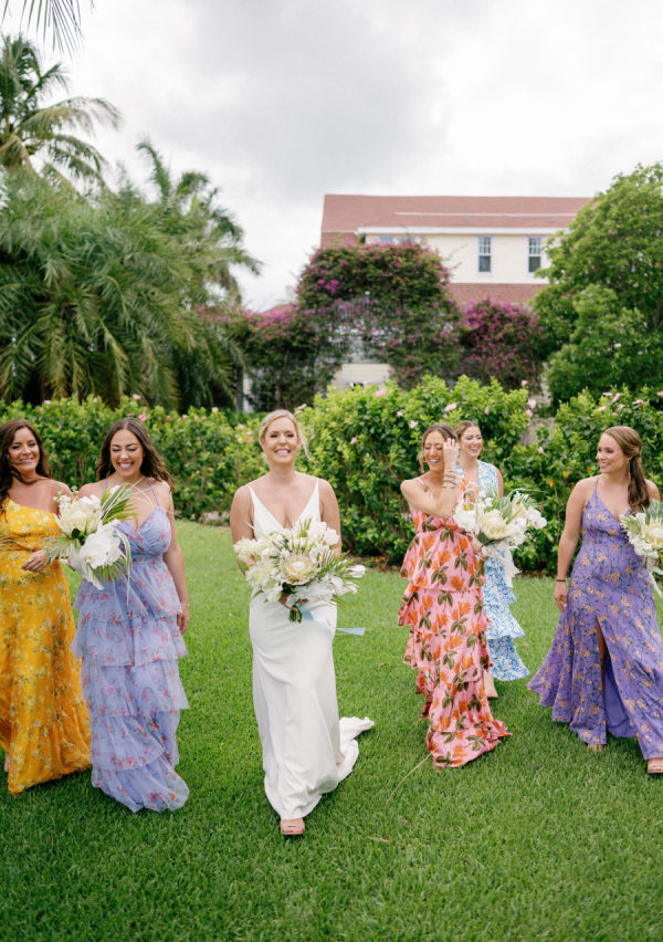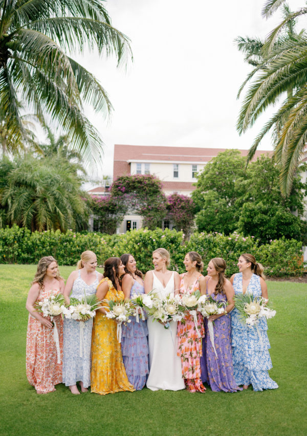 The wedding colors were mostly white with lots of tropical greenery and color on the bridesmaids dresses.