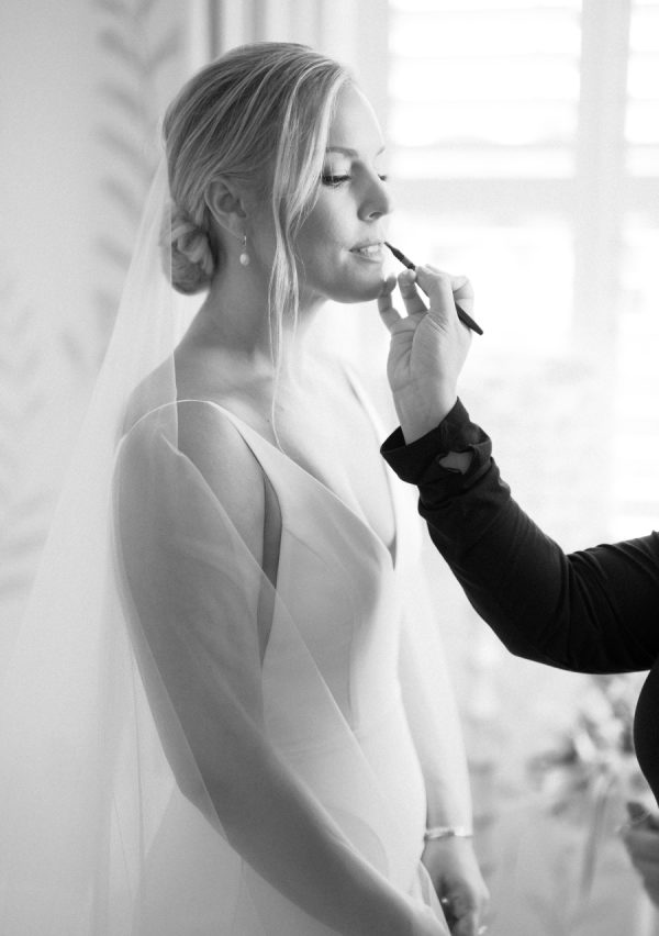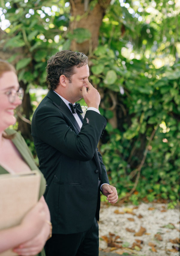 The bride was glowing in her v-neck and v-back button-down satin gown from Sarah Seven.
