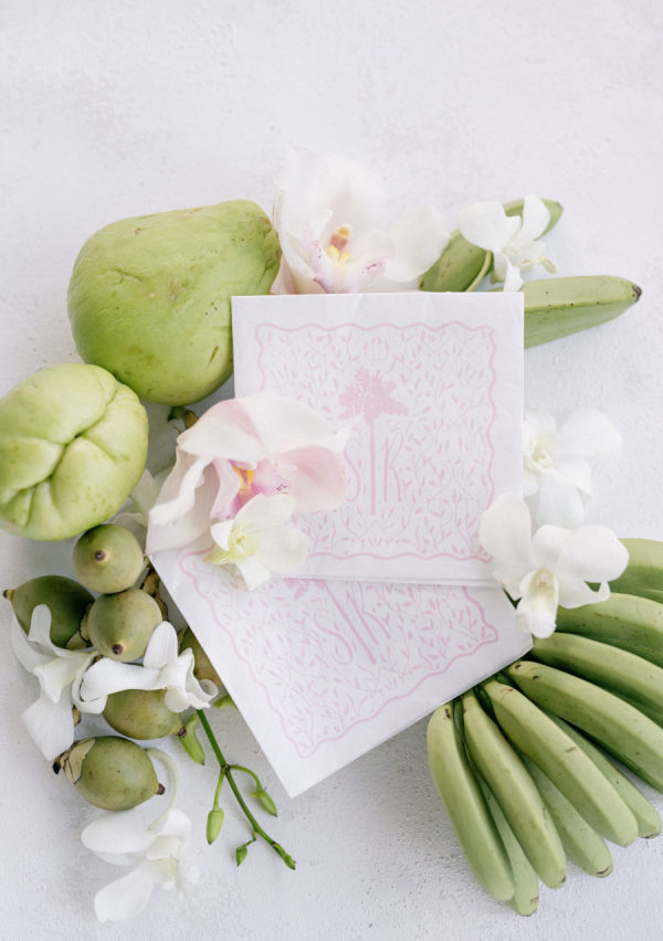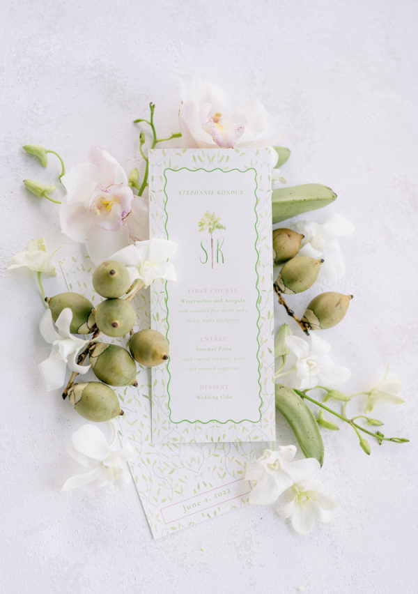 [field title=”Special Detail #1″]The tropical inspired invitations from Trout Designs were white with pink and light green accents of greenery and palm trees.[/field]