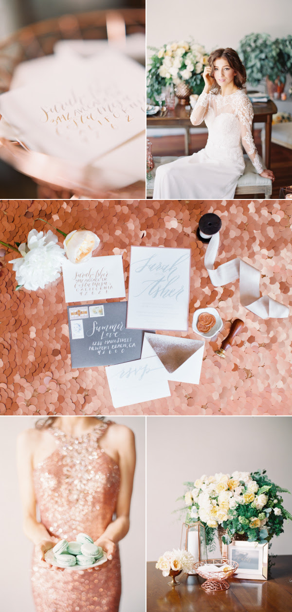 From Sposto Photography…Rose gold never goes out of style. It’s elegant, feminine, and completely timeless. Featuring the Loft On Pine’s lower level, this shoot was styled with some of Los Angeles and Orange County’s finest wedding vendors. The inspiration for this shoot started with Meghan Dubitsky of Green Apple Event Co. and a simple soap box. Adorned with golds, creams, and teals, this small hexagonal box (featured below) provided such a complimentary balance of color and sheen. One of our favorite elements of this shoot was the rose gold backdrop from Drop It Modern, It’s large sequins shimmered the perfect hue for this romantic shoot. Dripping with eucalyptus and garden roses, the tablescape offered a beautiful compliment to the rose-gold theme. The model wore Maggie Sottero’s Vaughn gown from their latest line and her hair and makeup was styled flawlessly by Chiali Meng. We were so fortunate to have such talented artists participating in bringing this idea to life.