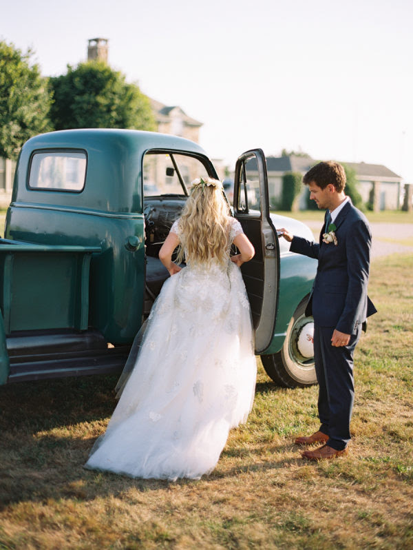 As our getaway car, Josh surprised me with the cutest green 1952 GMC truck. He knows I have an obsession with vintage trucks, and I nearly cried when I saw it parked there waiting for us! He had seen a local neighbor in Westport driving it around town, and he and my Mom pretty much stalked the owner until he was kind enough to lend it to us for the day. That drive back to the reception was actually one of the most memorable parts of our wedding day – the ride was the only real quiet few minutes that Josh and I got to spend alone together the entire day, and in that it was also terrifying and hilarious that we were alone, with no cell phones, driving this old truck that sounded like it could break down at any minute. But thankfully we did make it back, pulled right up onto my grandparent’s lawn, and were so overwhelmed with love as we saw all of our friends and family standing there cheering and welcoming us.