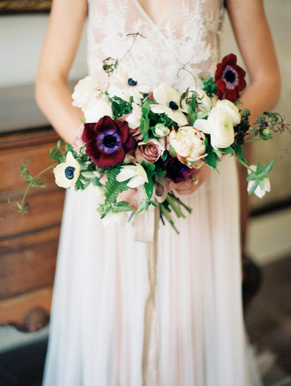 From Winsome and Wright… In designing and setting the scene for this moody, French inspired boudoir session it was important to me that you feel the bride is sure of herself, sophisticated and believes in understated beauty. Soft vintage waves and subtle makeup set the tone for the boudoir session. For Love & Lemons has some of the most beautiful, intricately designed lingerie, and it perfectly complimented the soft lines and skin of our bride. For our second boudoir look, a sheath dress by Karen Willis Holmes combined with a Naturae Design gold crown made for such an ethereal, moody look that completely shows almost always less is more! Transitioning to the bridal look, I wanted her look to be cohesive with the moodiness and romance of the morning. Karen Willis Holmes strapless gown paired with a simple, understated updo and a smokey brown eye was the perfect compliment. We chose a soft palate of organic purple, creams + whites for florals with the freeness and flow that Park Floral Design does so beautifully. Love letters and an invitation suite inked with warm brown stunningly penned by Michaela McBride Calligraphy was the perfect addition to our day.